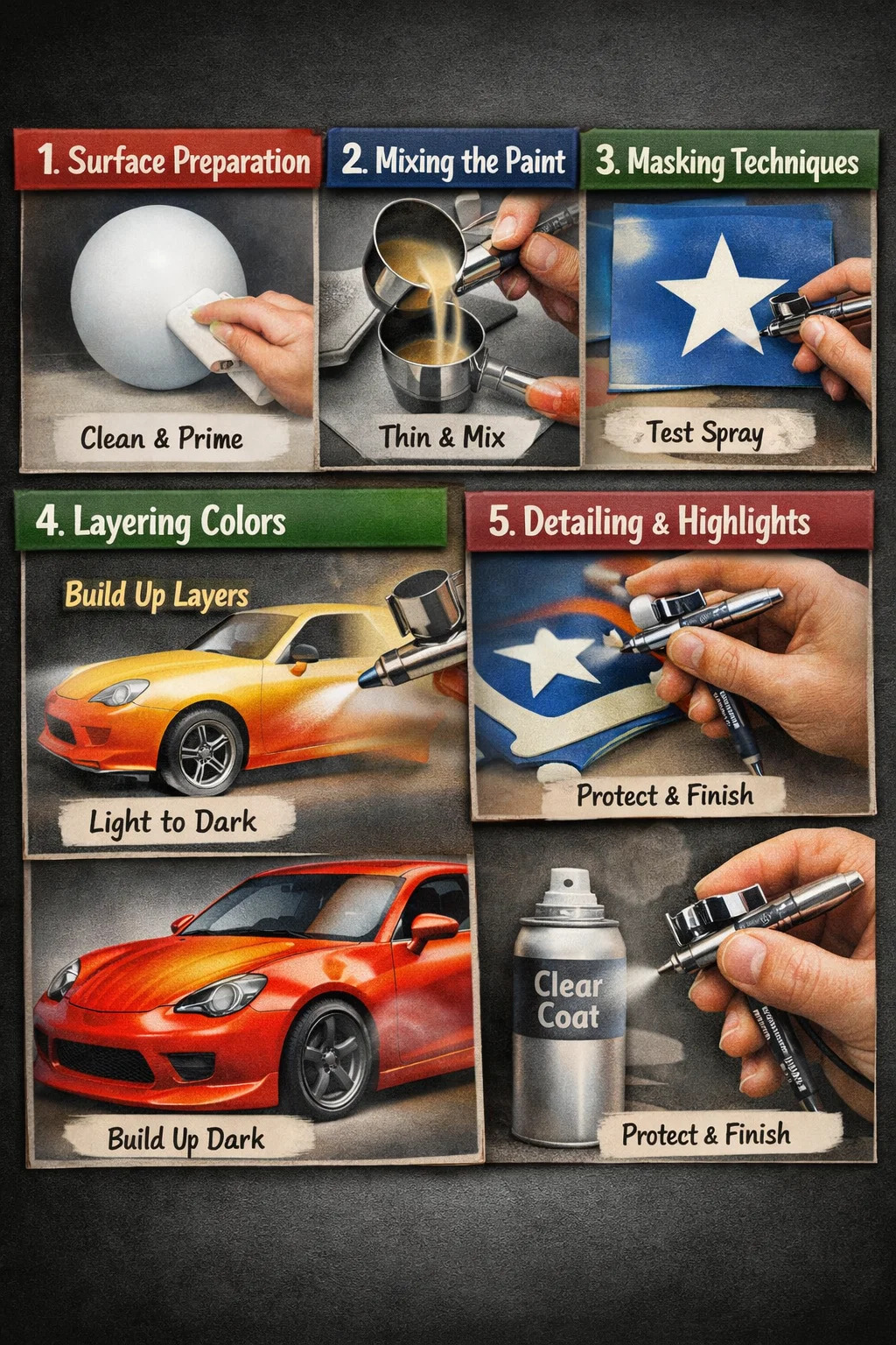 Leanann péintéireacht airbrush de ghnáth an loighic "dathanna solais ar dtús, ansin dathanna dorcha."