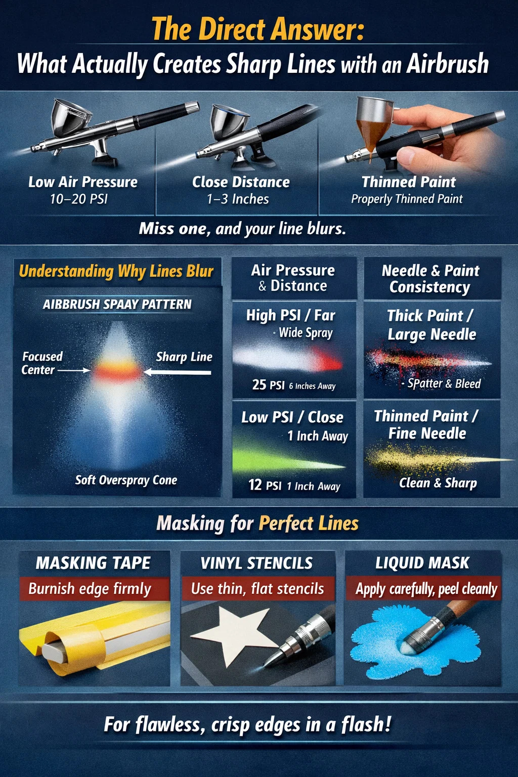 Tagann línte géara le haerbrush síos go dtí ceithre chroí-athróg ag obair le chéile: brú aeir íseal (10-20 PSI de ghnáth) , achar oibre gar (1-3 orlach ón dromchla), péint tanaithe i gceart, agus rialú truicear d'aon ghnó. Iníon fiú ceann amháin díobh seo, agus bogann do líne, fuileann nó splatters. Bíonn an chuid is mó de thosaitheoirí ag streachailt mar go n-oibríonn siad rófhada ón dromchla agus go n-úsáideann siad an iomarca brú - dhá nós a mharaíonn cruinneas láithreach.