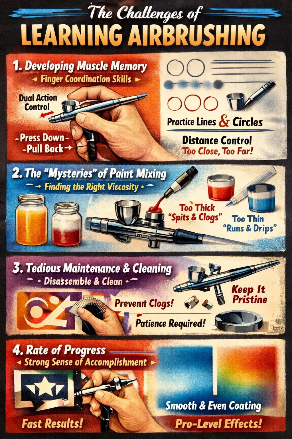 Tá foghlaim airbrushing scil atá "éasca a thosú, ach a éilíonn roinnt iarracht chun máistreacht." Murab ionann agus scuaba nó pinn traidisiúnta a théann i dteagmháil go díreach leis an dromchla, tá sé níos mó cosúil le teicníc chun "gaoth daite" a ionramháil.